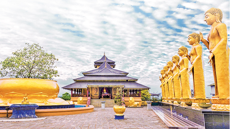 The gold coloured Buddha statues of the temple make for a unique and picturesque sight to behold in contrast to the blue sky above. The temple contains the holy relics of Lord Buddha.